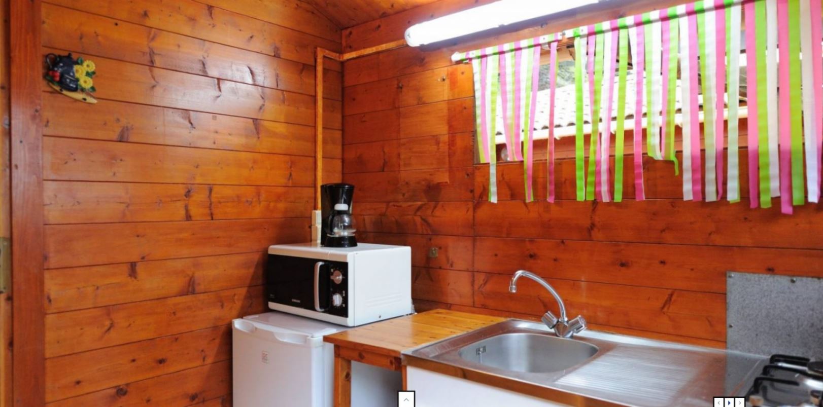 Superficie du chalet 24m2 salon, deux chambres, salle d’eau, cuisine extérieure couverte, terrasse couverte avec table pique-nique. Nous fournissons couvertures couvre lits oreillers vaisselle. ne sont pas fournis draps et linge de maison. Les chalets sont situés en hauteur une quinzaine de marches pour y accéder. les chalets ne sont pas climatisés .